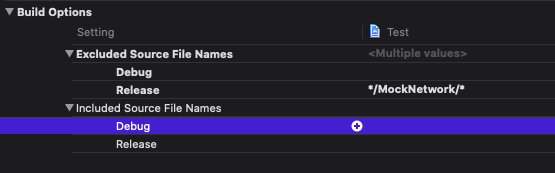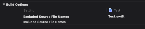 아래는 예시를 위해 debug일때 test.swift 파일을 제외한 경우입니다. 아래와 같이 파일을 추가할경우 빌드에 포함되지 않고, 코드내에서 불리지도 않습니다.