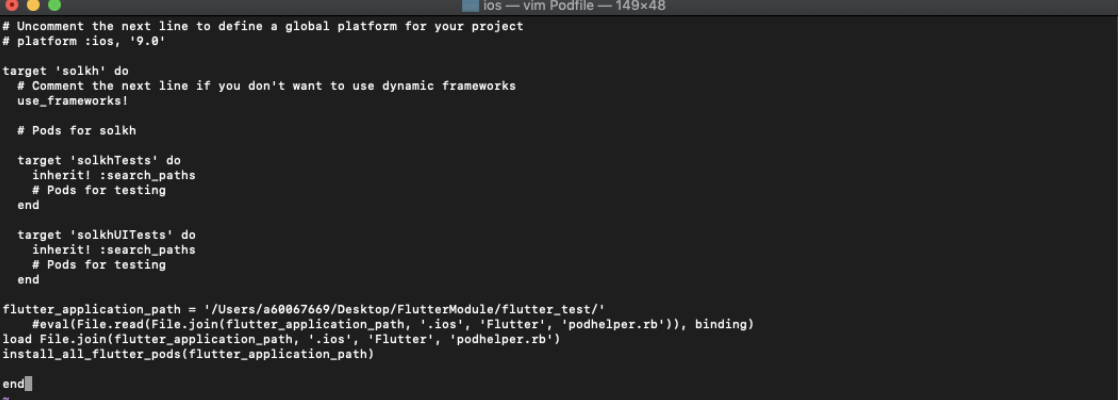 혹시 위의 예제에서 # 주석처리 되어있는 부분은 load file과 install_all_flutter_pods(flutter_application_path) 가 제대로 되지 않을경우 그 두줄을 지우고 실행해볼 수 있다.