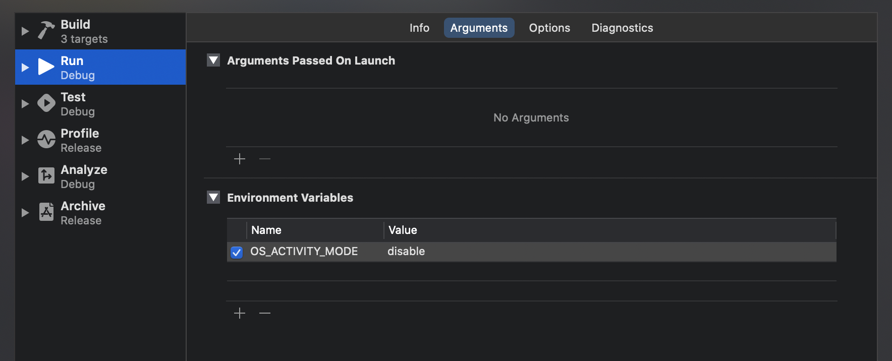 Edit Scheme에서, Run 모드일때 argument로 OS_ACTIVITY_MODE 를 선언하고 값을 disable로 선언한다.