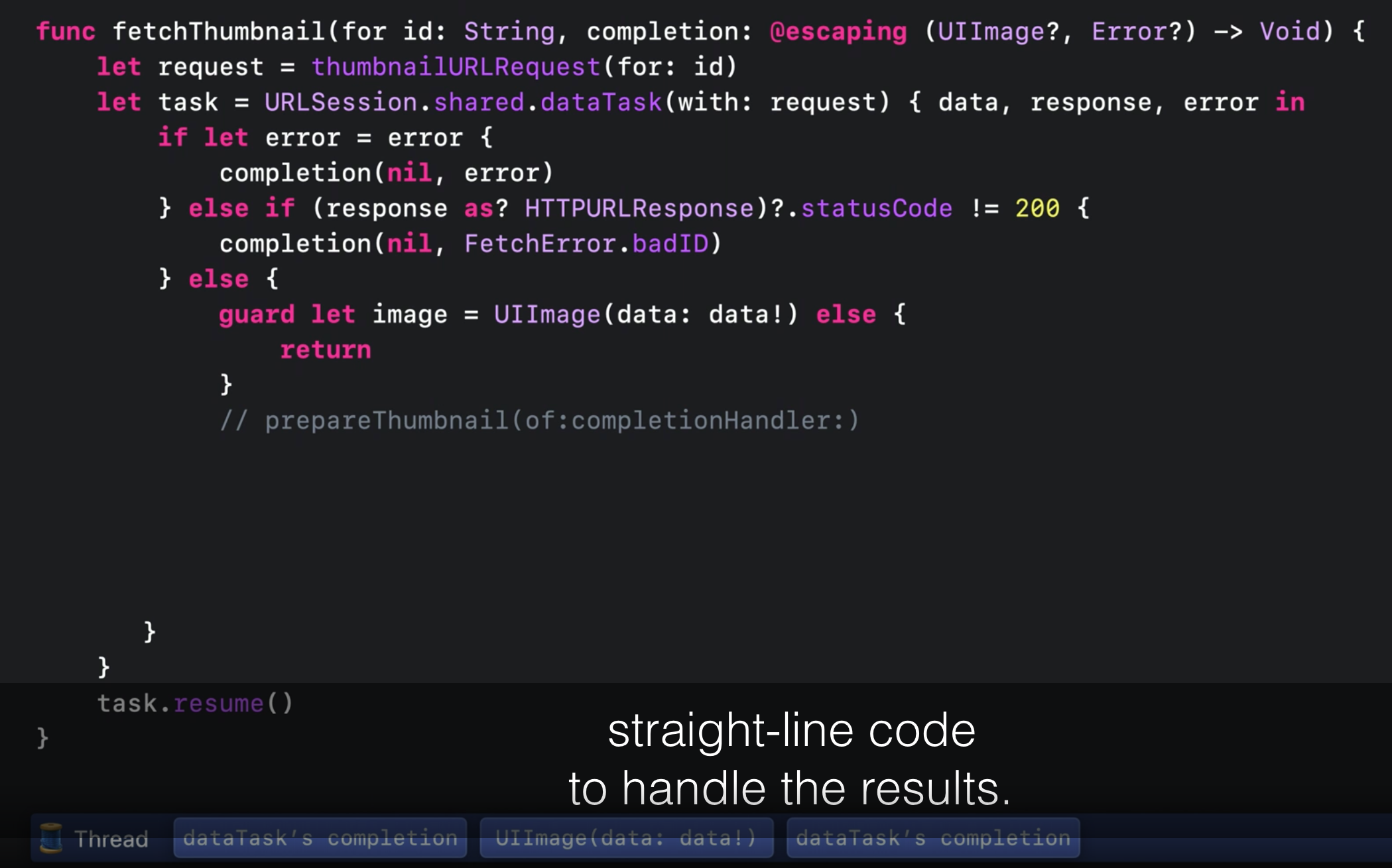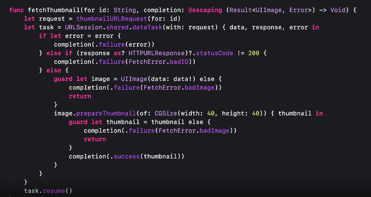 이제 Swift는 일반적으로 async/await로 알려진 패턴인 비동기 함수를 지원합니다. 새로운 구문으로 코드를 더 쉽게 읽고 이해할 수있는 방법을 알아보십시오. 함수가 일시 중단되면 어떻게 되는지 알아보고 기존 완료 핸들러를 비동기식 함수에 적용하는 방법을 알아 볼 수 있는 wwdc 영상이다!