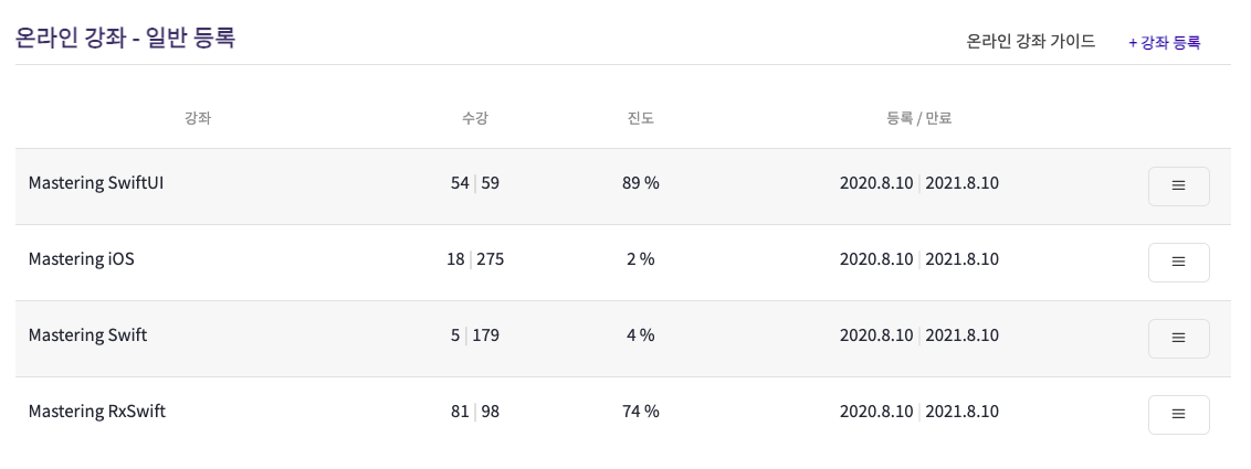 아래는 제가 듣고 있는 List에요. 2%, 4%에 의아하시겠지만, 강좌수가 정말 많아서 그렇고 제가 저 강의를 들을때 사실 이미 좀 개발을 1년 넘게 했을때고, 필요한 기초 지식인 강의만 계속 반복해서 들었어요.( 몇십회 반복....ㅎㅎ)